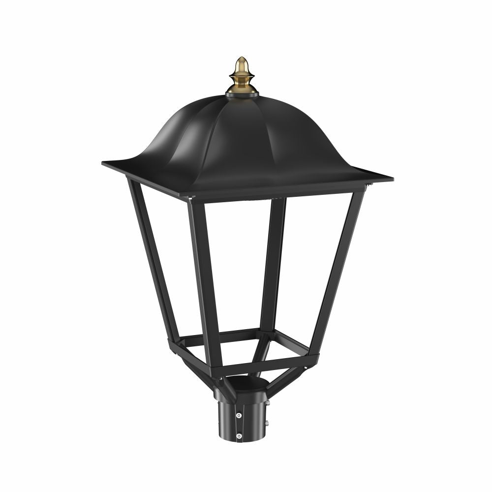 Högkvalitativ parkbelysning med den bästa kvalitén i branschen. Öppet armaturhus tillverkat av pulverlackad svart formgjuten aluminium. Packningar av åldersbeständigt material och samtliga skruvar av rostfritt syrafast material. Ljuskällan sitter i toppen och är väl avskärmad för att motverka spilljus och bidra till ljus komfort. För bästa värmeavledning och livslängd sitter kylflänsarna dolda inuti armaturhuset. Rundstrålande ljusfördelning för alla typer av offentliga platser och parkmiljöer. Kommer med förmonterad kabel och passar utan tillbehör på vertikala 80 mm stolpar.